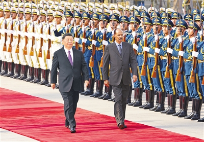 伊薩亞斯抵達(dá)時,禮兵列隊致敬。兩國元首登上檢閱臺,軍樂團(tuán)奏中厄兩國國歌,天安門廣場鳴放21響禮炮。伊薩亞斯在習(xí)近平陪同下檢閱中國人民解放軍儀仗隊,并觀看分列式。