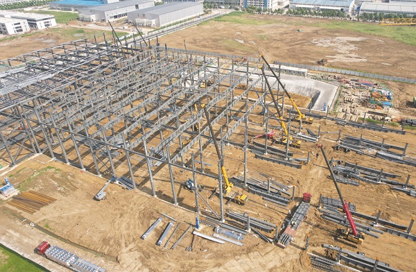 8月5日,壽縣新橋國際產業園壽州大道與和諧大道交口西北側一處建筑工地上,近十臺大型吊車馬達轟鳴,將一根根巨型鋼梁精準吊裝鋪架。這是總投資約4億元的伊戈爾電氣股份有限公司安徽生產基地主廠房正在加班加點進行施工。該項目主要生產變壓器及電源組件、智能箱變、電感、電抗器等,今年5月份開工建設,預計2024年3月份建成投產。項目全部投產達產后,可實現年產值約16億元,年入庫稅收約5000萬元。